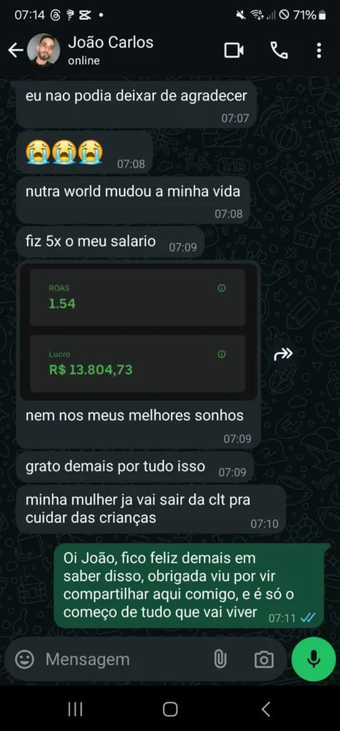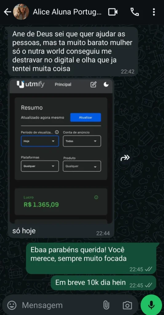 Movida pelo proposito de ajudar o próximo resolvi criar um curso pensado para realmente ajudar pessoas como você. Ele tem um valor acessível como nunca visto antes no nicho de nutra, acredito que ninguém deveria deixar um sonho de lado por falta de oportunidade. Minha missão é mostrar que, com as estratégias certas, você também pode transformar sua vida.
